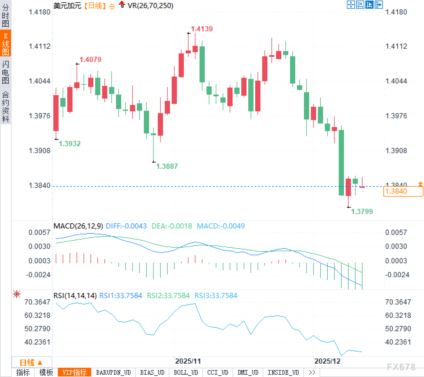 从日线看,美元兑加元自1.4139高点后重心下移,近期连续阴线放大并跌破前期整理区,最新报1.3840。下跌过程中最低触及1.3799,随后出现小实体K线与下影,显示短线抛压有所缓和但仍处弱势。